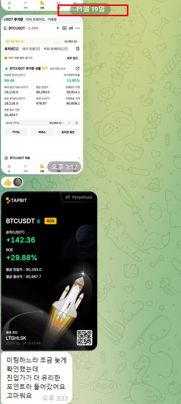 알려드리고 매매방 참여하셔서 매일 50~100만원씩 꾸준히 수익보고 계시며 은인을 만난거 같다며 매우 만족도가 높으십니다.