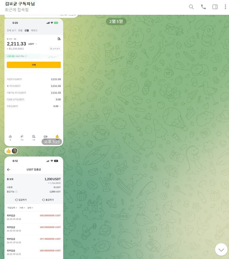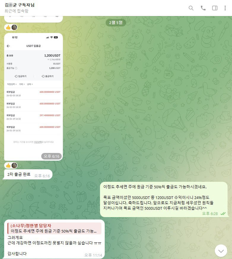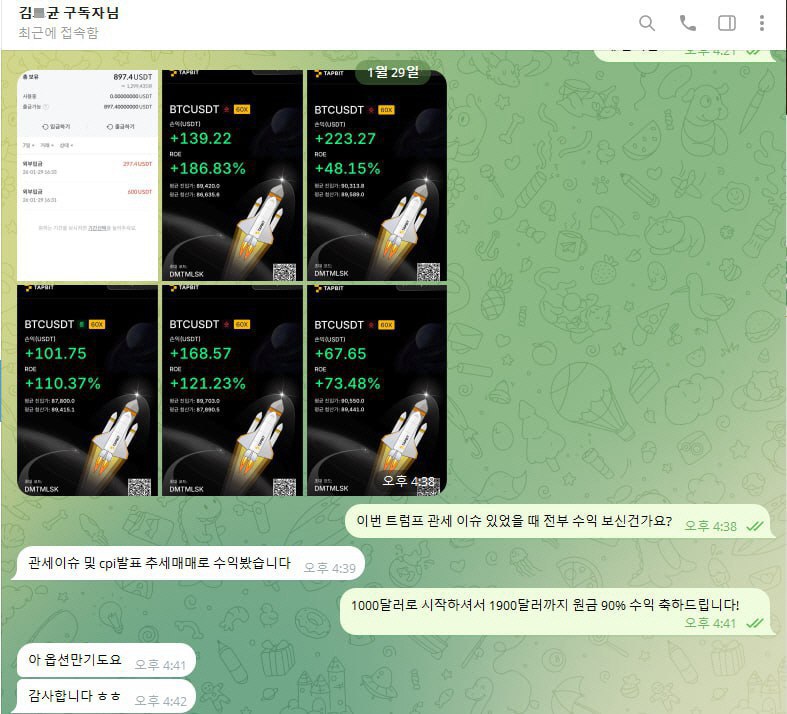 그러신 와중에 저희 회사를 통해 지표와 영상, 정보방과 스터디룸을 통해 수익금을 복리로 잘 쌓으셨습니다. 특히 이번 1월19~ 29일까지 트럼프 관세 이슈로 큰 하락이 지속되었을 때 원금대비 약 +90%, 그 이후 수익금 출금 후 29일부터 2월 5일까지 원금대비 약 +120% 까지 3주간 원금대비 누적 +210% 수익보셨습니다.